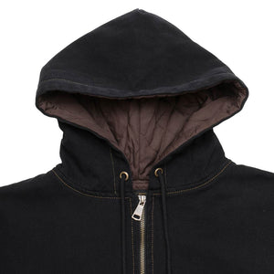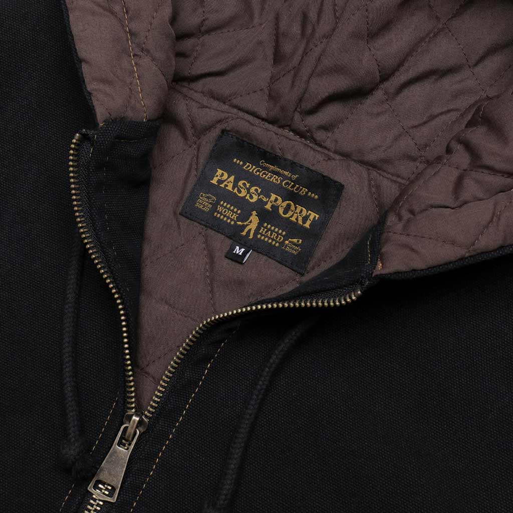 Pass~Port Diggers Club Zip hood in black from range #38. Made from 100% cotton heavy duty washed canvas shell and lined with cotton poplin lining. The Digger Club Hoodie also features digger embroidery on chest and drawstring hood.