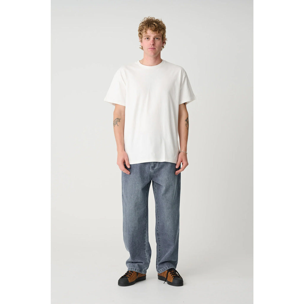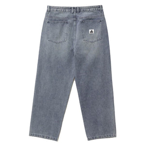 The signature Bull Denim 91 Pant in Ash Blue is a fixed waist baggy fit. Features extra wide cut leg in a washed denim, they have an oversized waist with an extended rise, roomy thigh, and slightly tapered cuff.